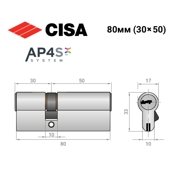 - Циліндр CISA AP4 S 80 (30*50) нікель матовий 3 ключі ⭐