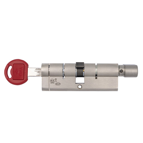 Всі кодуючі піни виготовлені з гартованої сталі підвищеної твердості, що створює захист від висвердлювання. Також в плагу циліндра розташовані захисні штифти. Разом в комплексі вони ускладнюють проходження свердла та при спробі свердління воно ламається. Це підтверджується сертифікатом з високим рівнем зламостійкості – SKG** (дві зірки з трьох можливих). Але ми все одно рекомендуємо при встановленні вхідних дверей використовувати врізну броненакладку. Вона підсилить конструкцію та завадить будь-якій маніпуляції із циліндром.