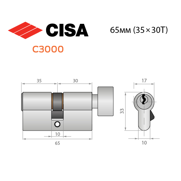 Купити циліндр CISA C3000 65T (35*30T) нікель матовий в роздріб і гуртом можна на нашому сайті.