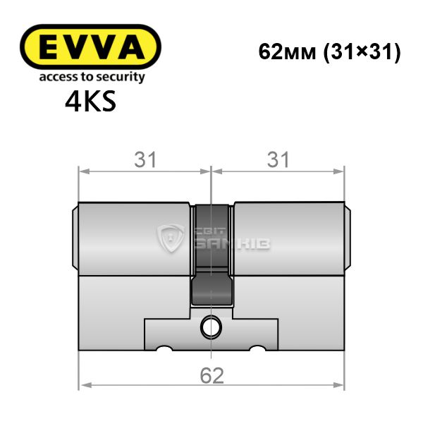 Циліндр EVVA 4KS 62 (31*31) нікель сатин 3 ключі