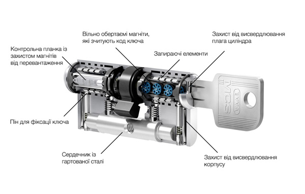 Вони приводять в дію фіксуючі елементи серцевини тільки при правильній полярності магнітів на ключі.