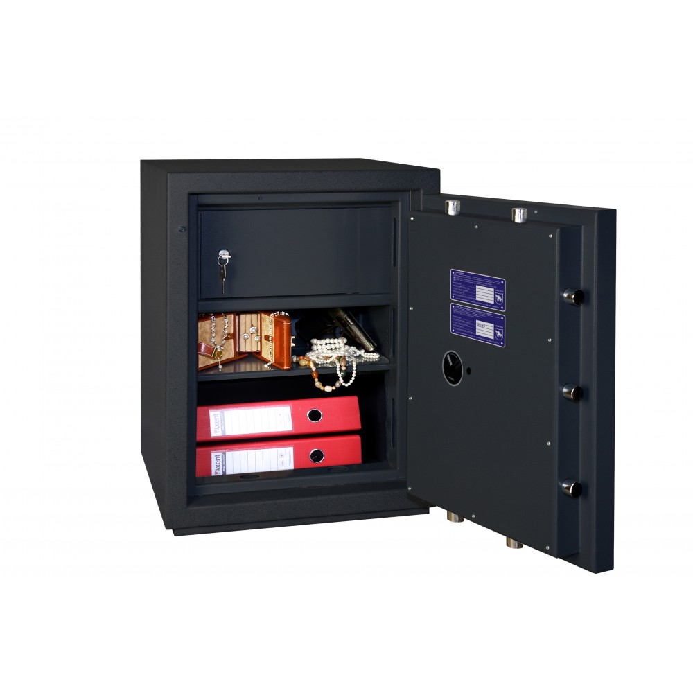 Український виробник ПАРИТЕТ-К є одним із найкращих та найпрогресивніших в сфері проектування та виготовлення сейфів будь-якої категорії. Дана модель GRIFFON CL III.68.К.Е відноситься до вогнезламостійких. Вона здатна захищати цінності від зламу (III клас ДСТУ) і дії вогню (клас LFS 30 P). Це означає, що під час пожежі протягом 30 хвилин температура всередині сейфу не підніметься вище 170°C, чого достатньо для збереження паперових документів. Відносно компактні розміри дозволяють розташувати його практично будь-де в приміщенні. Для надійності кріплення внизу сейфа передбачені отвори для анкерних болтів. Це дозволить закріпити його до підлоги.