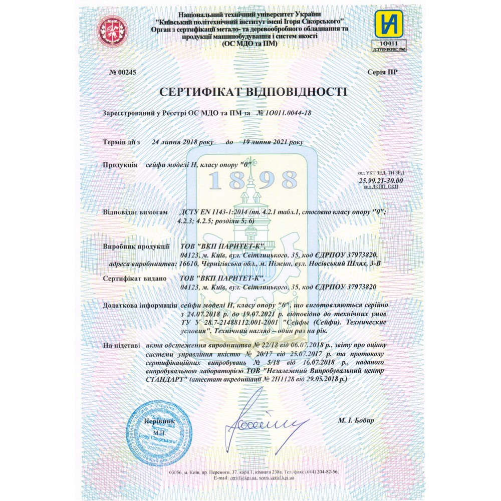 У комплекті йдуть ключі, інструкція з експлуатації та паспорт з серійним номером. Гарантія на конструкцію сейфа складає 5 років, на замок 1 рік.