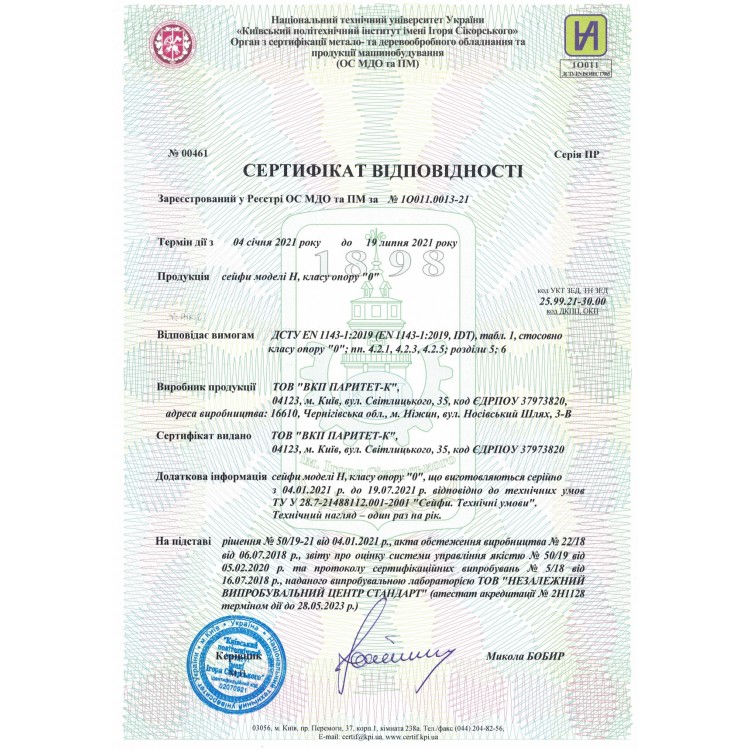 У комплекті йдуть інструкція з експлуатації та паспорт з серійним номером. Гарантія на конструкцію сейфа складає 5 років, на замок 1 рік.
