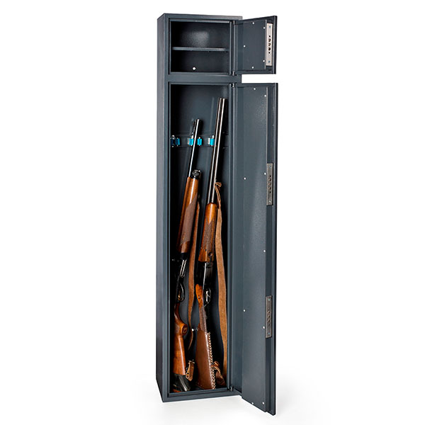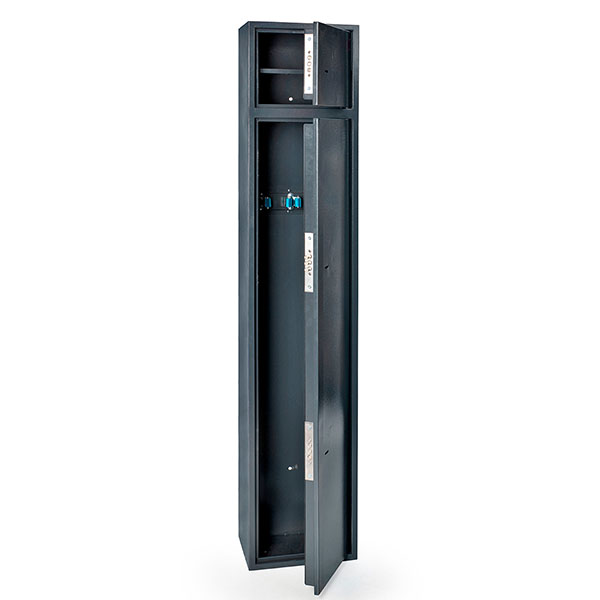 Сейф FEROCON Barett відноситься до збройових. Основне призначення – зберігання ТРЬОХ мисливських гладкоствольних рушниць. Головною його фішкою є наявність двох відділів. Верхній призначений для зберігання патронів, негабаритних документів чи цінностей. Має зйомну полицю, яка допомагає розділити загальний об’єм на 2 частини. Головний нижній відділ в свою чергу включає 3 ложемента під зброю. Загальні розміри становлять 1500 мм по висоті, 300 мм по ширині і 200 мм по глибині. Доволі великі габарити потребуватимуть окремого місця в приміщенні. Це потрібно враховувати при виборі. Для надійності кріплення передбачені отвори для анкерних болтів. Це дозволить закріпити його до стіни та підлоги.