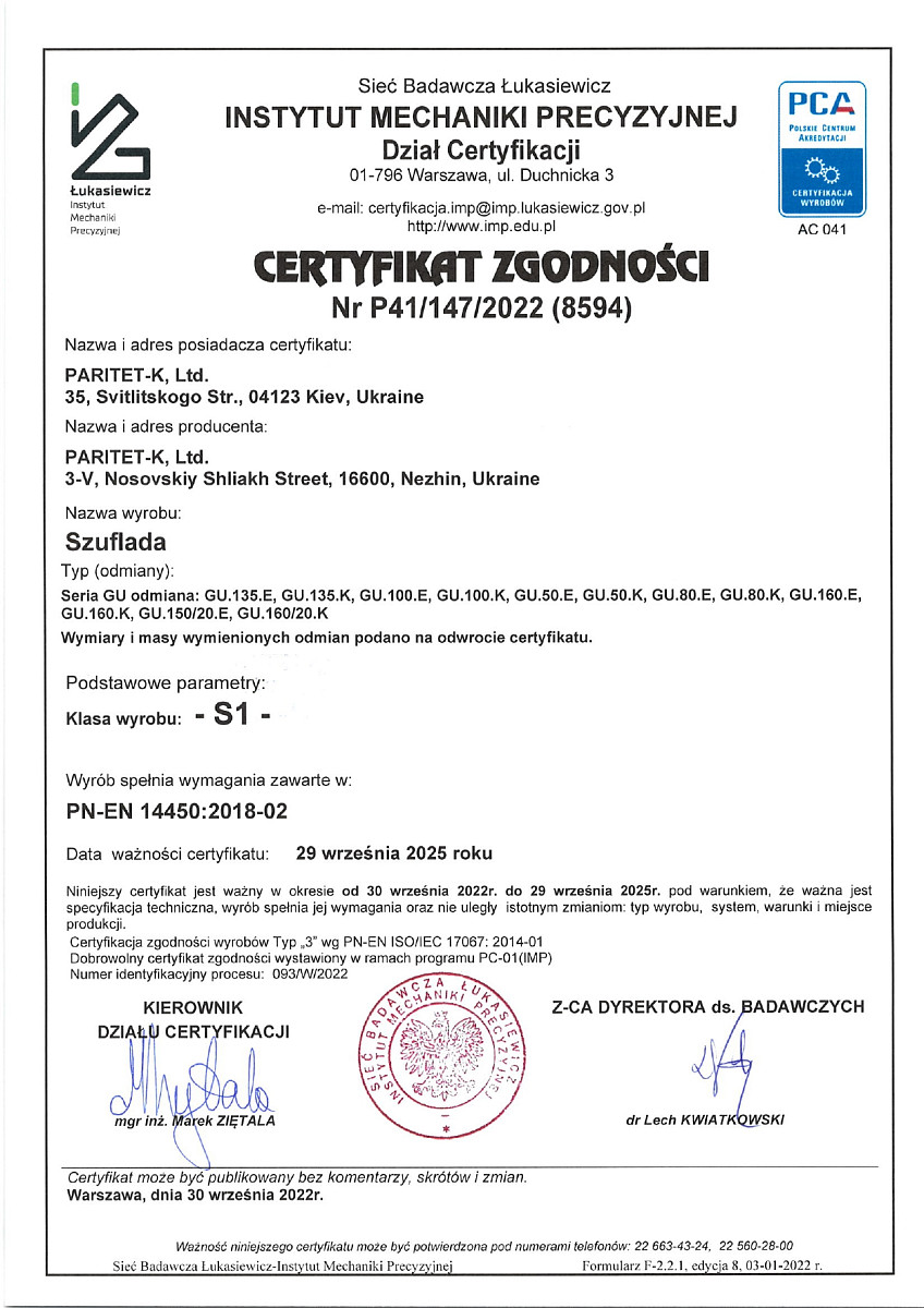 Український виробник ПАРИТЕТ-К є одним із найкращих та найпрогресивніших в сфері проектування та виготовлення сейфів будь-якої категорії. Дана модель GRIFFON GU.100 Е відноситься до збройових. Вона має сертифікат зламостійкості класу S1 за стандартом EN 14450. Основне призначення - зберігання зброї довжиною до 910 мм. Відносно компактні розміри та горизонтальна конструкція дозволяють розташувати сейф під ліжком чи гардеробній кімнаті. Для надійності кріплення передбачені отвори для анкерних болтів. Це дозволить закріпити його до підлоги.
