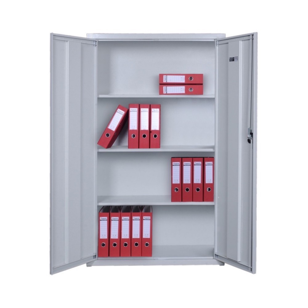 Корпус і двері з двох половинок виготовлені із металу завтовшки 1 мм. Шафа зачиняється ключовим замком EURO-LOCKS на одну засувку, тому особливого захисту не несе. В сірому кольорі відмінно доповнить будь-яке сучасне приміщення та не буде виділятись.