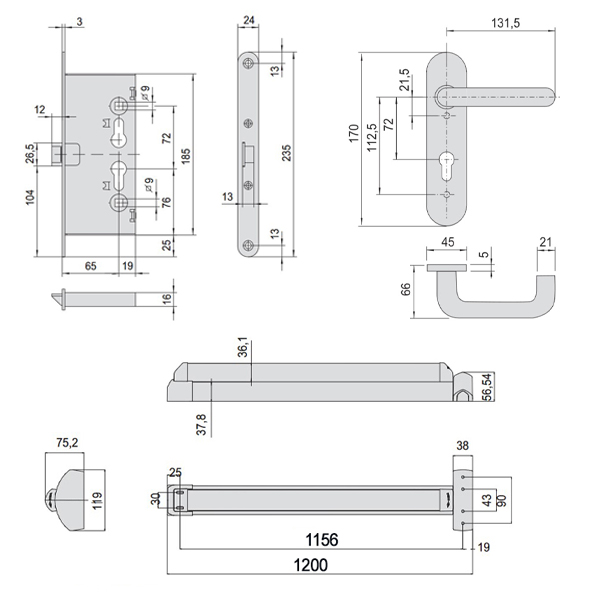 - Розмір механізму антипаніки – 119х38х56,54 мм.