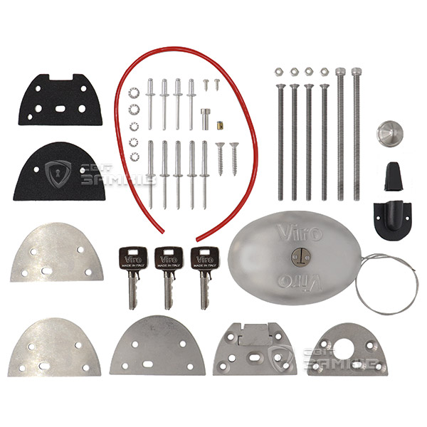 Італійський накладний автомобільний замок VIRO VANLOCK R. Використовується для замикання задніх або бокових дверей фургонів та мікроавтобусів. Має унікальну форму корпусу у вигляді «панцира», без гострих кутів та захватних точок. Матеріал виготовлення корпусу – нержавіюча сталь, що забезпечує високу стійкість до корозії та несприятливих погодних умов. Керується серцевиною з англійським ключем. Додатково серцевина оснащена захисною планкою проти висвердлювання. Закривається автоматично шляхом захлопування, а відкривається тільки ключем. У випадку якщо двері захлопнулись і хтось залишився всередині, замок має спеціальний трос розблокування за допомогою якого двері можна буде відкрити зсередини. Завдяки своїй формі такий замок не піддається висвердлюванню, перепилюванню та виламуванню.