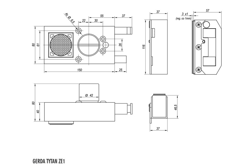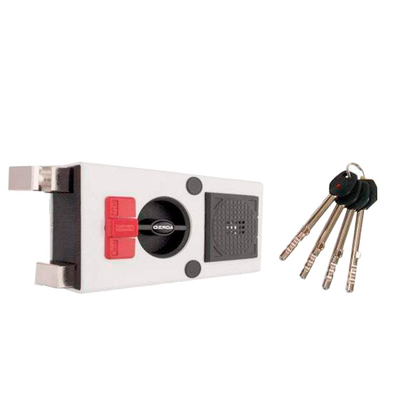 Польський замок GERDA TYTAN ZE 1 кріпиться накладним монтажем на дверне полотно. Як правило встановлюється на вхідні дерев’яні та металеві двері будинків, дач, гаражів, складів та різних підсобних приміщень. Особливістю цього замка є наявність сигналізації. При спробі віджимання дверного полотна, прикладання сили понад 50 кг, спрацьовує гучна сирена в 110 Дб. Живиться, вбудована сигналізація, за рахунок двох батарейок типу «Крона». Також дану модель накладного замка можна підключити до загальної охоронної системи приміщення. Зовні керується серцевиною з трубчастим ключем, з середини – воротком. Довжина ключа 75 мм, тому замок можна накладати на дверні полотна товщиною до 70 мм. Має три положення виходу ригелів. В першому положенні (один оберт ключа) сигналізація вимкнена. При двох обертах ключа сигналізація вмикається, що супроводжується коротким звуковим сигналом. В третьому положенні (три оберти ключем) вороток блокується і відкрити замок можна тільки ключем ззовні.