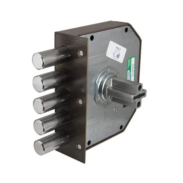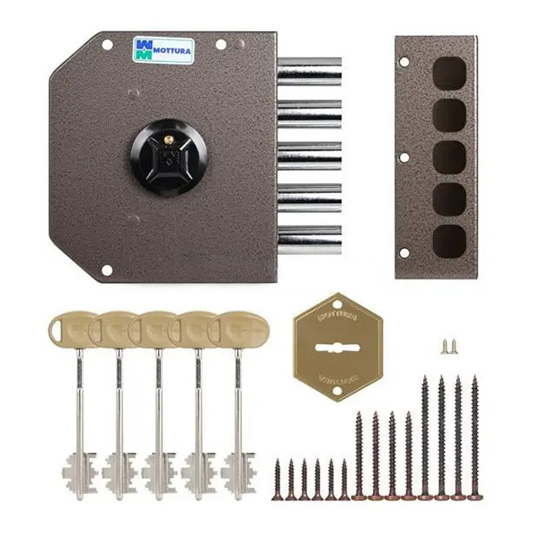 MOTTURA 20500VD – це 5-ригельний італійський замок. Встановлюється НАКЛАДНИМ способом на дверне полотно. Використовується на вхідних дерев’яних та металевих дверях квартири чи будинку. Також його часто обирають для монтажу в гаражах чи складських приміщеннях, де встановити врізний замок немає можливості або це не доцільно.