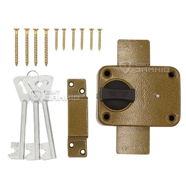 Польський замок JANIA T-3 (Z005) накладного типу. Такий замок чудово підходить для встановлення на дерев’яні двері в гараж, склад, різні підсобні приміщення, на ворота і хвіртку. Секрет замка складують спеціальні металеві пластини – сувальди. Завдяки чому такий замок стійкий до корозії, вологи, перепаду температур, потрапляння пилу чи бруду. Універсальний – підходить для лівих та правих дверей. З внутрішньої сторони керується воротком.