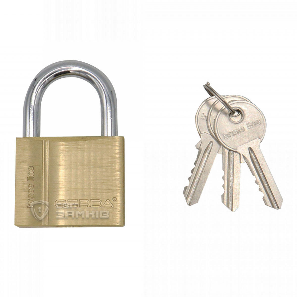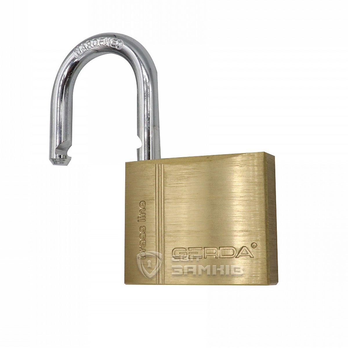 Серія польських навісних замків GERDA KMZ. Корпус виготовлений з латуні, легкий та приємний на дотик. Дужка замка виготовлена із гартованої сталі, завдяки чому вона має захист від перекусування та перепилювання. Замок можна закрити без ключа, потрібно лише натиснути на дужку. В середині замка дужка фіксується з двох сторін, що підвищує її стійкість до силового навантаження.