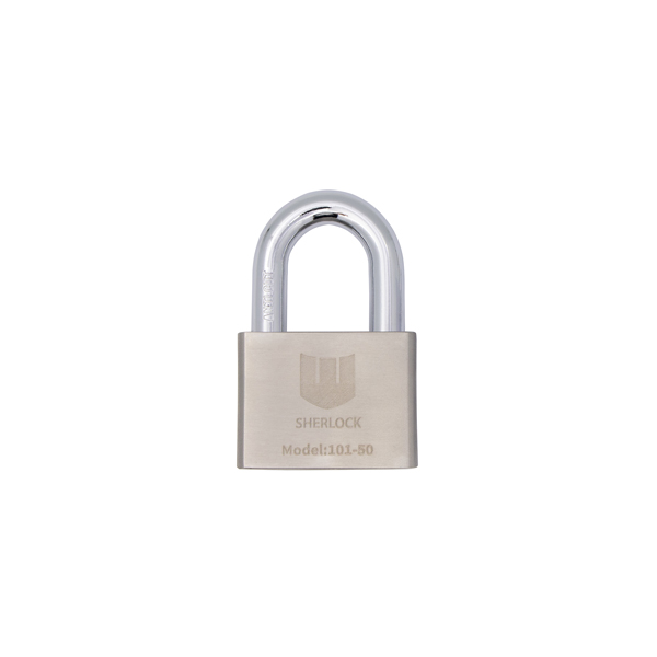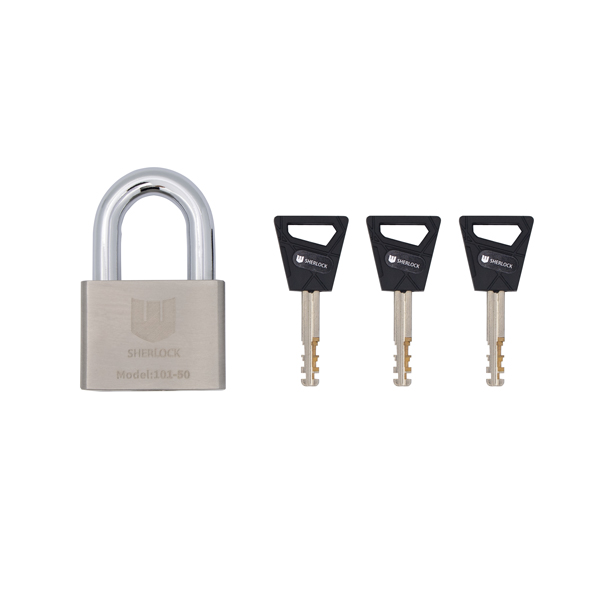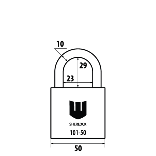 SHERLOCK 101-50 - навісний замок дугоподібного типу з високим рівнем захисту. Він має нерозбірну конструкцію – дужка не відділяється від корпуса. Вона міцно фіксується з двох сторін.