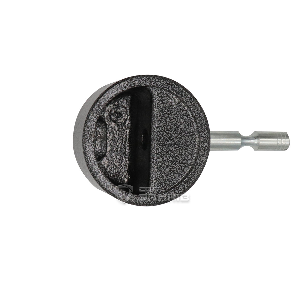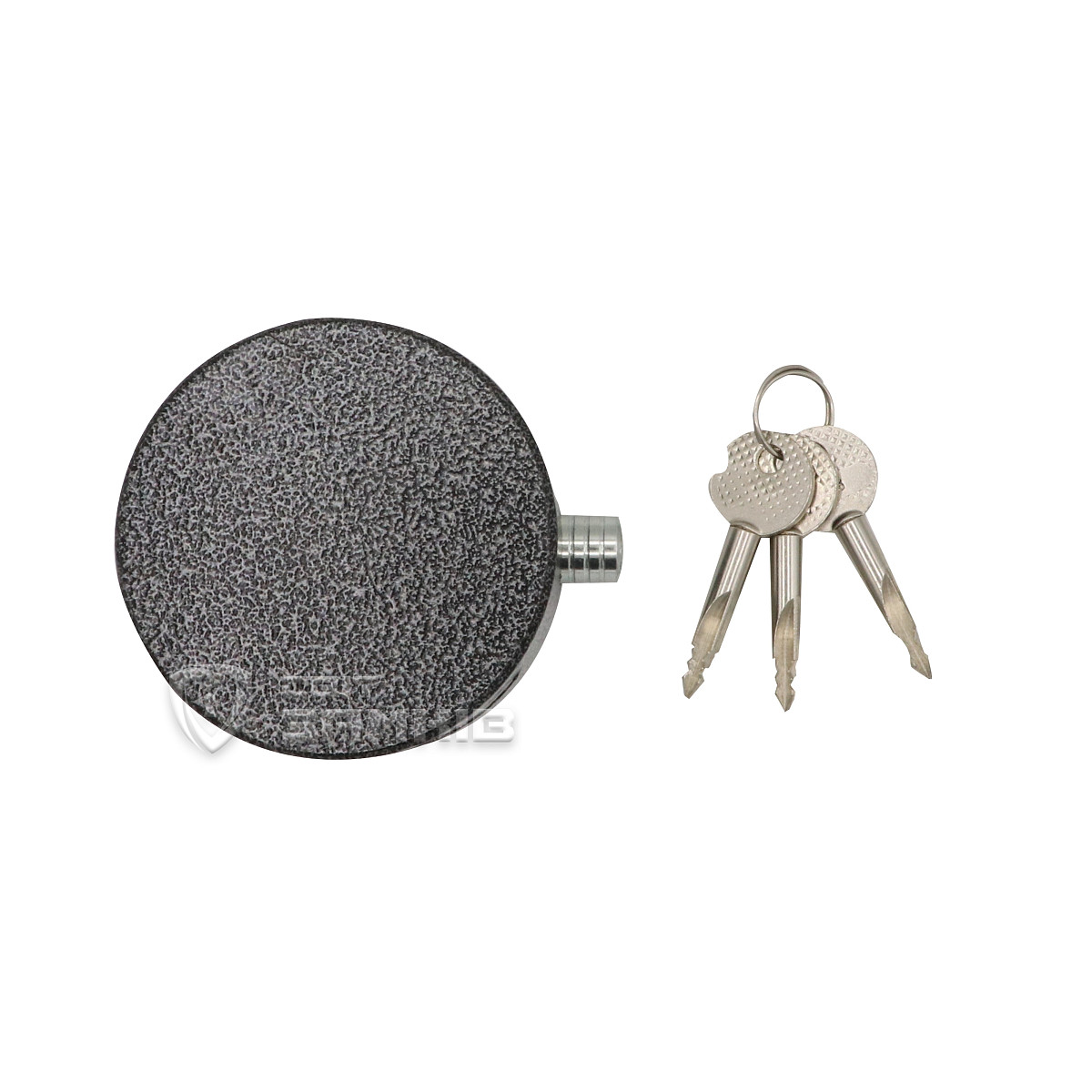 Навісний замок крабоподібної форми КІРОВ ВС1. Сконструйований для використання на розсувних дверях та решітках, для гаражних дверей, воріт та хвірток. Сталевий корпус та гартована сталева дужка забезпечують надійних захист від силового зламу та поганих погодних умов. Завдяки конструкції корпусу у формі шайби такий замок важко збити, а дужка в нього захована від перепилювання. Керується серцевиною з хрестовидним ключем.