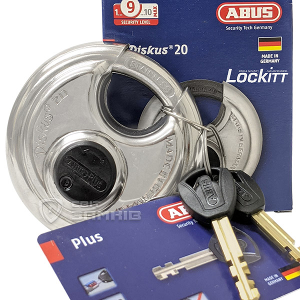 Німецький навісний замок серії ABUS Diskus. Призначений для використання на дверях, воротах, контейнерах, хвіртках, в гараж тощо. Замок 8-го рівня безпеки з 10-ти за шкалою надійності ABUS.Особливістю цієї серії є дискова форма корпусу. Завдяки чому дужка більш прихована, що значно підвищує її захист від будь-яких спроб вплинути на неї. Сам корпус та дужка виготовлені із гартованої сталі. Володіє стійкістю до корозії та вологи.