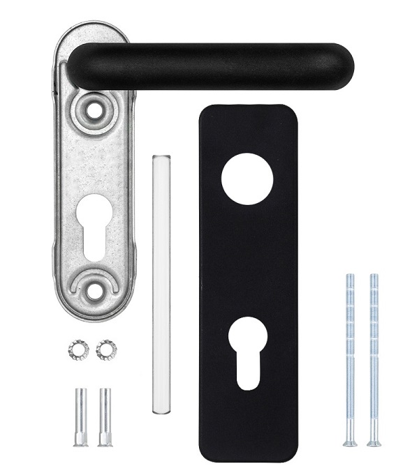 Ручки на планці SANTOS 1919 з лаконічним дизайном в чорному кольорі призначені для встановлення на протипожежні вхідні металеві двері товщиною від 40 до 63 мм із замком під серцевину. Внутрішня плата виготовлена зі сталі. Міжосьова відстань складає 72 мм. Це основний критерій в процесі вибору такого типу дверних ручок. Планка ручки кріпиться до дверного полотна гвинтами М5.