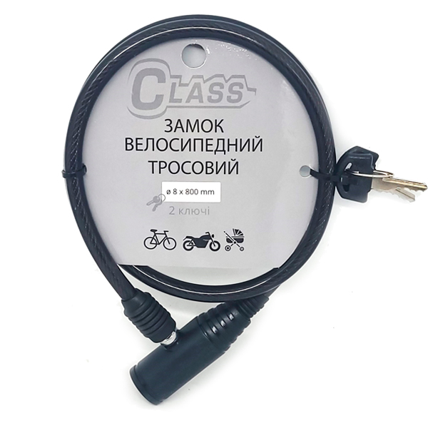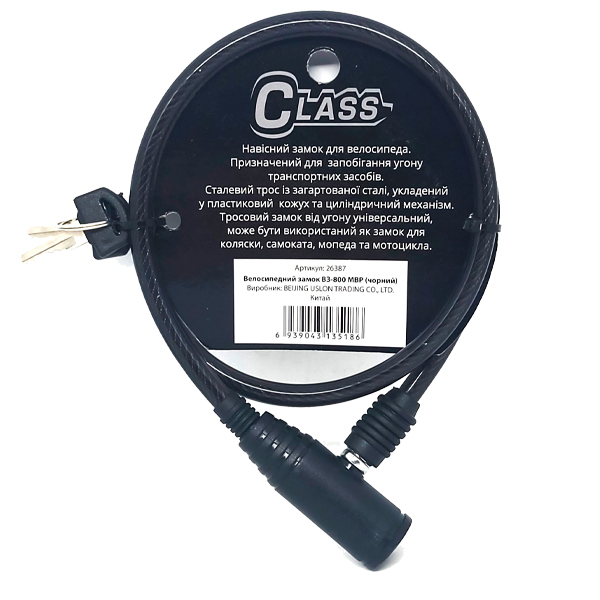 CLASS ВЗ-800 MBP – це надійний навісний замок для велосипеда. За конструкцією це трос довжиною 80 см з товщиною 8 мм. Виготовлений із загартованої сталі. Для того, щоб не пошкодити Ваш велосипед та захистити його від подряпин, він спеціально покритий ПВХ чохлом.