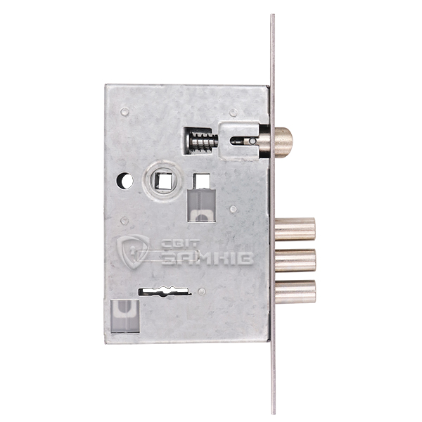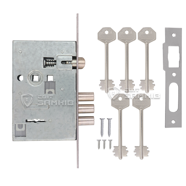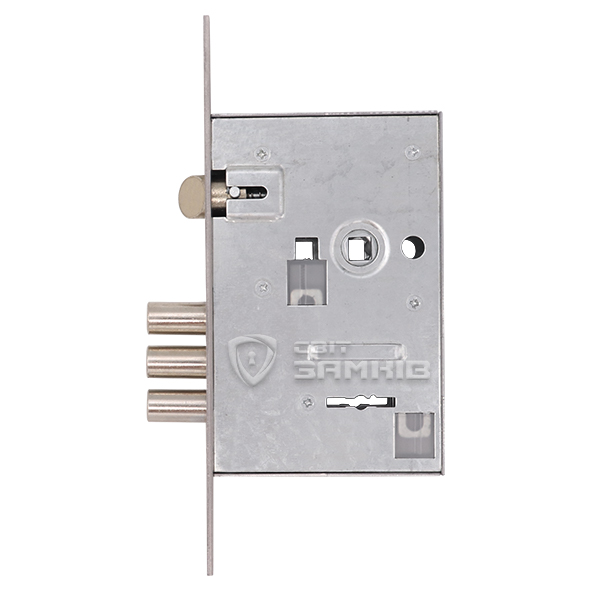 Закривання здійснюється 3-ма ригелями зі сталі діаметром 16 мм. Вони надійно фіксують двері, забезпечуючи достатній рівень безпеки. Язичок реверсивний, тому замок можна встановити як і на ліві, так і на праві двері. В даній версії в комплектації 5 ключів.