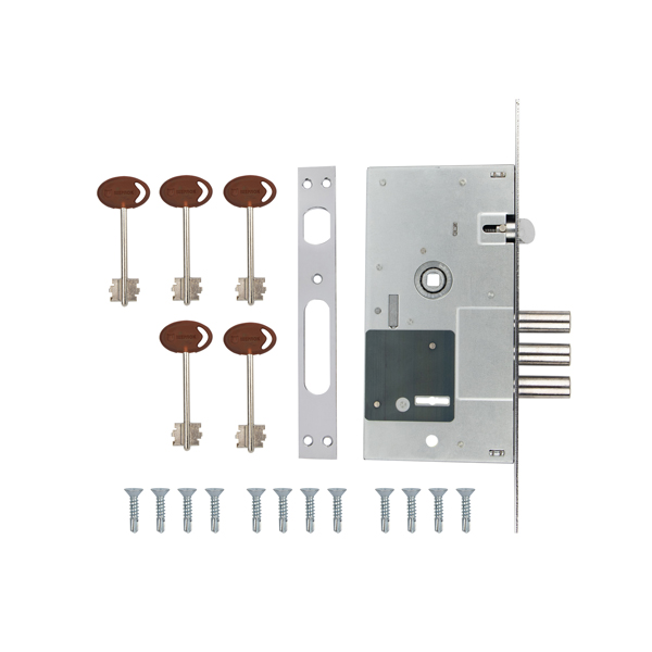 Підходить для металевих та дерев’яних дверей. Можна встановлювати на праві та ліві двері. Закривається замок трьома круглими ригелями, повний вихід яких — 36 мм.