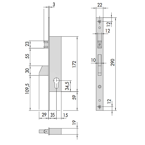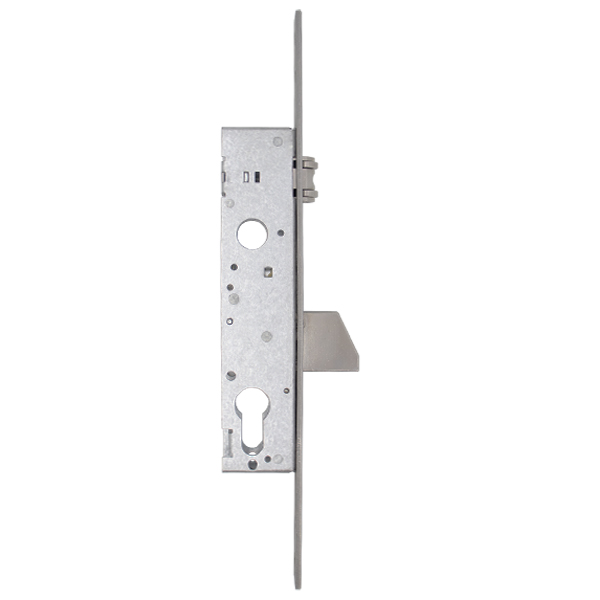 CISA 46230 – врізний замок, що призначений для вхідних розпашних дверей з алюмінію або сталі. Товщина корпусу становить лише 19 мм, що робить його зручним для установки у вузькі профілі. Тому його також можна встановлювати у хвіртках. Замок виконує функцію основного та керується циліндром стандарту EURO DIN (серцевина купується окремо).