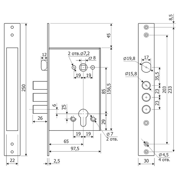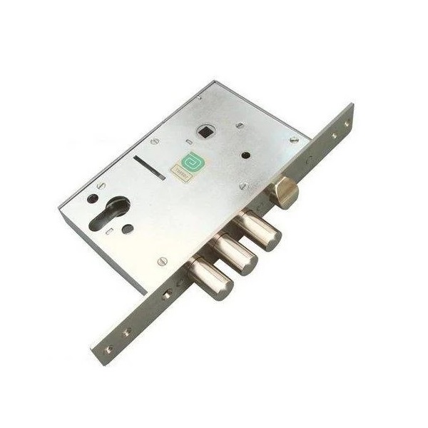 • Отвори для кріплення врізної броненакладки посилені втулками для захисту корпусу замка від деформації.