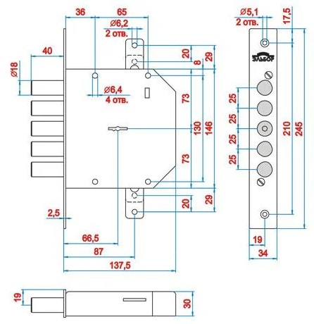 Встановлюють такий замок переважно на двері товщиною від 40 до 80 мм. Через його розміри встановити на двері із меншою товщиною неможливо. П'ять круглих ригелів із виходом 40мм забезпечать надійний захист дверей від віджиму, а загартована вставка в ригелі захистить їх від перепилювання.