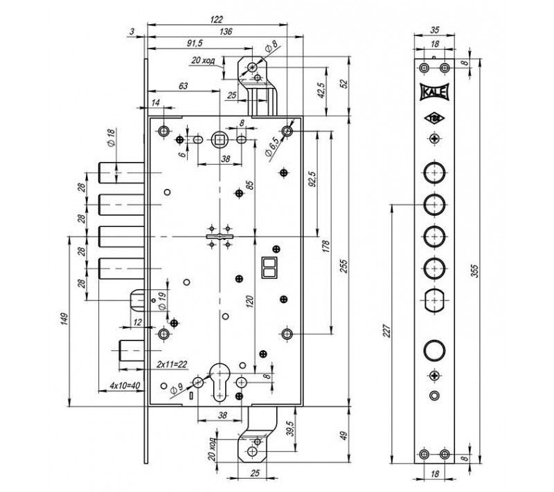 В даному замку є можливість установки тяг. Сам корпус може бути встановлений як в ліво, так і правосторонні двері. Повний вихід ригелів діаметром 18 мм складає 40 мм. Особливістю цього замка є наявність провушин для кріплення тяг. Серцевина в комплект не входить та докуповується окремо в залежності від ваших потреб.