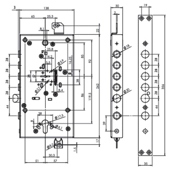 Ізраїльський виробник MUL-T-LOCK відомий на ринку якістю своєї дверної фурнітури. Дана модель - це 4-х ригельний замок з язичком і допоміжним ригелем під циліндр. В корпусі поєднано дві системи замикання: сувальдна і циліндрова. Сам корпус може бути встановлений як в ліво, так і правосторонні двері. Повний вихід ригелів діаметром 18 мм складає 36 мм. Особливістю цього замка є наявність провушин для кріплення тяг. Завдяки кодовій пластині в комплекті його легко перекодувати в разі втрати ключів. Зусилля на ригеля передаються за допомогою редукторної передачі. Також при закритому замку блокується язичок. Серцевина в комплект не входить та докуповується окремо в залежності від ваших потреб.