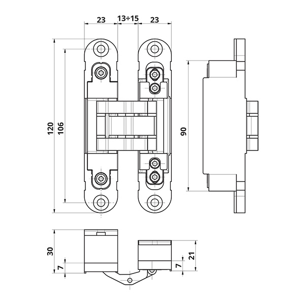 Завіси ТМ OTLAV виготовляються в Італії. Цей виробник давно відомий на ринку та має більше сотні патентів в сфері фурнітури для дверей і вікон. Відповідно його виробництво гарантує стандарти якості. Дана модель - це петля прихованого монтажу. На практиці це буквально означає, що вона захована всередину дверного полотна та не виступає за його площину. З точки зору безпеки подібне виконання є найкращим, адже такий завіс не можна вибити або спилити. OTLAV Invisacta IN230 виготовляється із цинкового сплаву ZAMAK та призначений для дерев’яних дверних полотен. Завдяки малій глибині врізки (21 мм) може ставитись і на алюмінієві двері. Сім опорних точок і нейлонові вставки забезпечують їхнє плавне відкривання на 180º (за відсутності лиштви). Це означає, що у повному відкритому стані двері не будуть заважати, займаючи житловий простір. Дана модель регулюється в 3-х вимірах: вертикаль, горизонталь, притиск. Таким чином, можна добитись максимальної точності та відсутності будь-яких щілин. Важливим аспектом при підборі завіс являються габарити дверей. Знаючи їх, Ви дуже просто визначитесь із кількістю необхідних петель з розрахунку того, що навантаження повинно бути не більше 60 кг на 2 петлі (80 кг - на три). OTLAV Invisacta IN230 виконаний в мінімалістичному стилі. Регулювальні гвинти приховуються спеціальними ковпачками, тому їх не видно навіть при відкритих дверях. Це все дає великий простір для цікавих дизайнерських втілень. В матовому хромованому кольорі ці завіси будуть вдалим рішенням на дверях світлих відтінків - від тепло-сірих до бежевих.