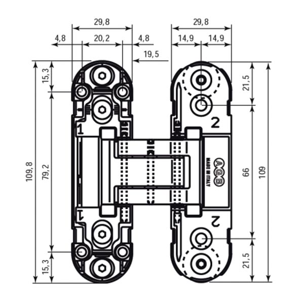 Італійська ТМ AGB на сьогодні являється європейським лідером з виробництва дверної фурнітури. Обумовлює це насамперед технологічна перевага та постійні інновації, які є основою якості продукції. Дана модель AGB Eclipse 2.0 - це завіс прихованого монтажу. На практиці це буквально означає, що він захований всередину дверного полотна та не виступає за його площину. З точки зору безпеки подібне виконання є найкращим, адже таку петлю не можна вибити або спилити. AGB Eclipse 2.0 виготовляється із цинкового сплаву ZAMAK та призначений для дерев’яних дверних полотен товщиною від 40 до 44 мм. Забезпечує їхнє плавне відкривання на 180º (при відсутності лиштви). Це означає, що у повному відкритому стані двері не будуть займати житлового простору та заважати. Дана модель регулюється в 3-х вимірах: вертикаль +/- 2 мм, горизонталь +/- 1,5 мм, притиск +/- 1,0 мм. Таким чином, можна добитись максимальної точності та відсутності будь-яких щілин. Важливим аспектом при підборі завіс являються габарити дверей. Знаючи їх, Ви дуже просто визначитесь із кількістю необхідних петель з розрахунку того, що навантаження повинно бути не більше 40 кг на 2 петлі, або 60 кг - на 3. AGB Eclipse 2.0 виконаний в мінімалістичному стилі, тож стане незамінним аксесуаром для прихованих дверних полотен. Регулювальні гвинти не будуть видимими за спеціальними ковпачками навіть при відкритих дверях. Це все дає великий простір для цікавих дизайнерських втілень в сучасному хай-тек напрямку. В білому кольорі ці завіси будуть вдалим рішенням на дверях аналогічних відтінків для того, щоб максимально уникнути контрастів та не привертати зайвої уваги.