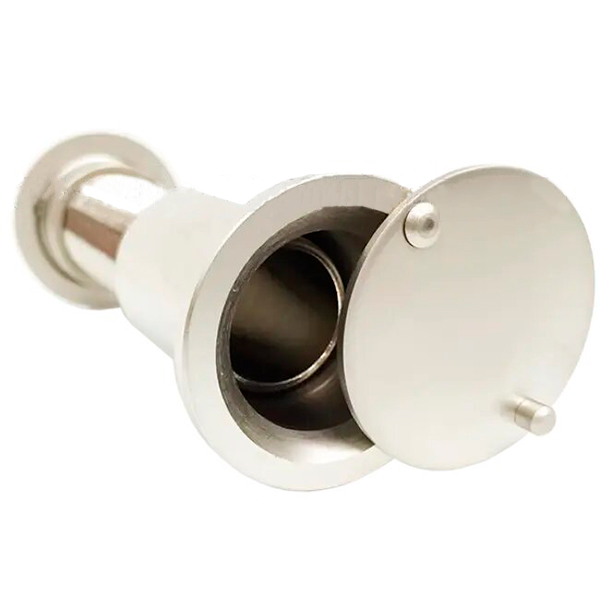 Диаметр врезной части составляет 27 мм. Оптика глазка обеспечивает широкий угол обзора в 180 градусов. Оснащен специальной шторкой для того, чтобы свет не попадал внутрь помещения.