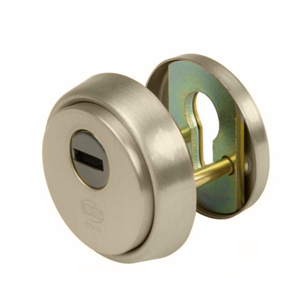 Продукция ТМ AMIG производится в Испании. На данный момент это один из лучших местных производителей дверной фурнитуры. Среди его ассортимента для защиты дверей обязательным для установления является протектор (или броненакладка). Его основная задача - усложнить или вообще исключить возможность злоумышленникам попасть внутрь помещения, сломав замок. Данная модель AMIG 31 устанавливается на входную дверь вместе с замками и сердечником стандарта EURO DIN. Изготовлена из закаленной стали. Имеет специфическое расстояние между крепежными отверстиями - 26 мм. Поэтому подходит преимущественно для замков испанских производителей AZBE, TESA MCM и т.д. Монтируется накладным методом. Он проще, чем врезной, и не требует высверливания отверстий для посадки броненакладки. Однако в таком случае она не образует с замком монолитную конструкцию, из-за чего легче добраться до стяжных винтов и срезать их. Чашка позволяет немного утопить протектор, но все равно пространство между ним и сердцевиной остается. Само крепление осуществляется стяжными винтами М6x50. Длина винтов позволяет ставить броненакладку на дверные полотна толщиной от 40 до 45 мм. Эти цифры указаны с учетом того, что винты закручены на всю длину крепежного отверстия. Таким образом, протектор защищает сердцевину от физических и силовых методов взлома - сверление и выбивания. Высота (или толщина) протектора составляет 14 мм, диаметр - 65 мм. В цвете "матовый никель" лучше будет дополнять двери светлых оттенков - от тепло-серых до бежевых.