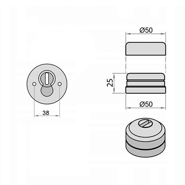 Высота (или толщина) протектора составляет 25 мм, диаметр – 50 мм. Особенностью этой модели является широкое ключевое отверстие. Благодаря этому протектор более универсален и может применяться с большим количеством сердцевин. Для его защиты от высверливания в конструкции предусмотрена вращающаяся пластина из нержавеющей стали.