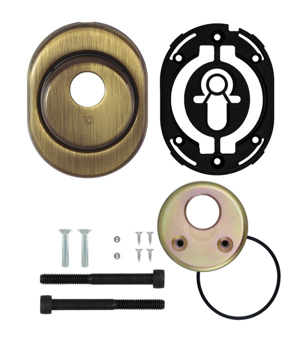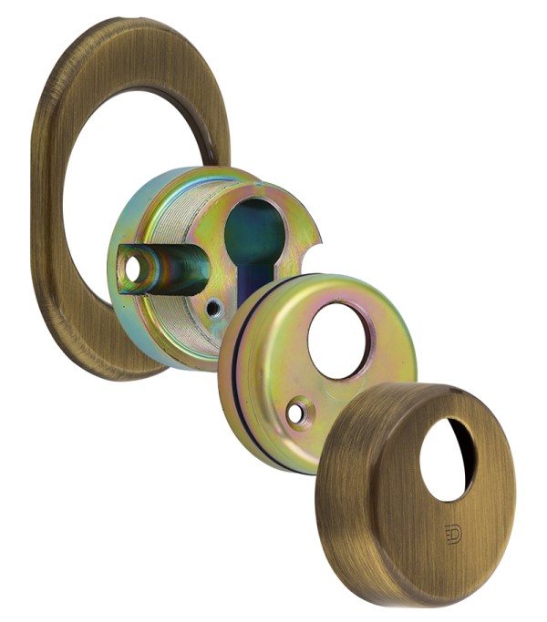 Монтируется врезным методом: по его диаметру делается отверстие в дверном полотне. Крепится сквозь вокруг сердцевины стяжными винтами М6 с технологией Flex. Ее суть заключается в более мелкой резьбе и определенной насечке. Благодаря этому и специальному виду жесткой стали винты выдерживают нагрузку в 5 раз больше, чем обычные. Так они создают монолитную конструкцию с сердцевиной. Протектор для внешней стороны двери выбирается отдельно. В цвете "бронза сатин" лучше будет дополнять двери с пыльно-землистой палитры.