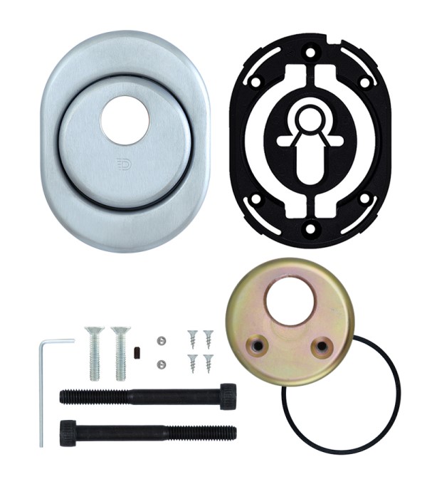 Монтируется врезным методом: по его диаметру делается отверстие в дверном полотне. Крепится сквозь вокруг сердцевины стяжными винтами М6 с технологией Flex. Ее суть заключается в более мелкой резьбе и определенной насечке. Благодаря этому и специальному виду жесткой стали винты выдерживают нагрузку в 5 раз больше, чем обычные. Так они создают монолитную конструкцию с сердцевиной. Протектор для внешней стороны двери выбирается отдельно. В цвете “хром матовый” лучше будет дополнять двери светлых оттенков - от тепло-серых до бежевых.