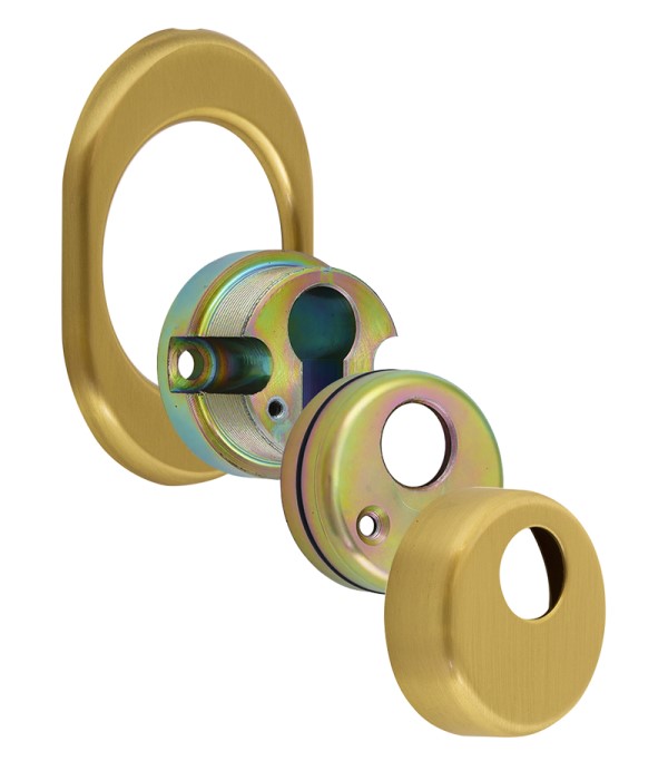Монтируется врезным методом: по его диаметру делается отверстие в дверном полотне. Крепится сквозь вокруг сердцевины стяжными винтами М6 с технологией Flex. Ее суть заключается в более мелкой резьбе и определенной насечке. Благодаря этому и специальному виду жесткой стали винты выдерживают нагрузку в 5 раз больше, чем обычные. Так они создают монолитную конструкцию с сердцевиной. Протектор для внешней стороны двери выбирается отдельно. В цвете "латунь матовая" лучше будет дополнять двери светлых оттенков с бархатистым и сочным покрытием - тем же шпоном вишни или груши.