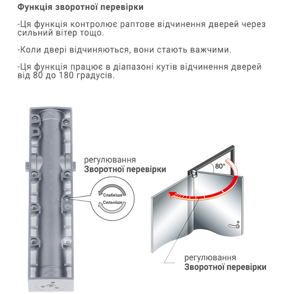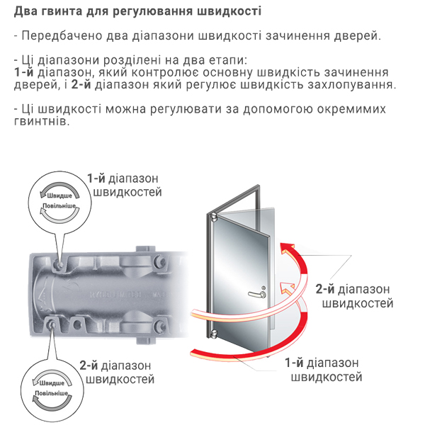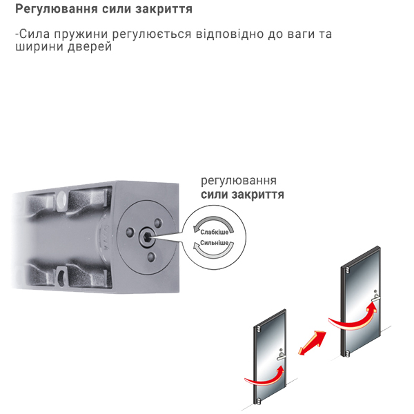 Непосредственно на корпусе есть возможность регулировать основную скорость в пределах 130-10°, скорость захлопывания - 10-0° и ветровой тормоз после угла 70-80°. Данная функция защищает дверное полотно от удара о стену и вырыв тяги доводчика. Благодаря этому можно добиться индивидуальной настройки закрывания двери так как Вам нужно.