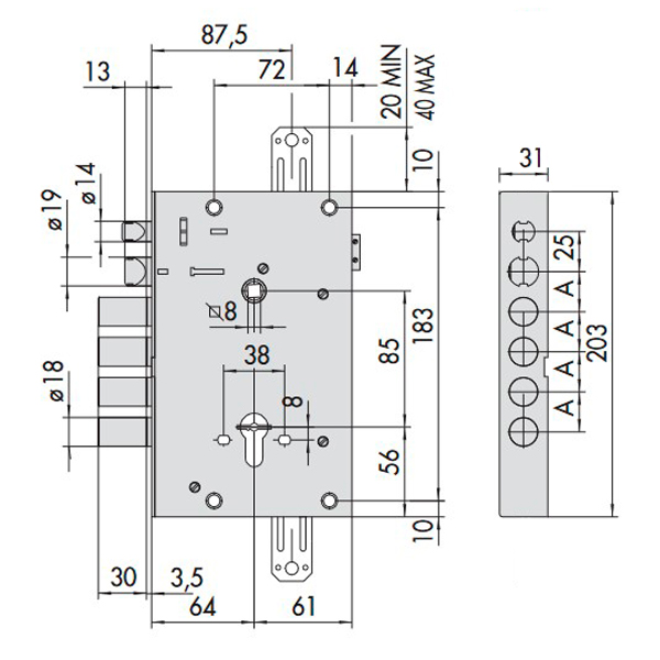Замок является аналогом врезного механизма CISA 15535, но без торцевой планки.