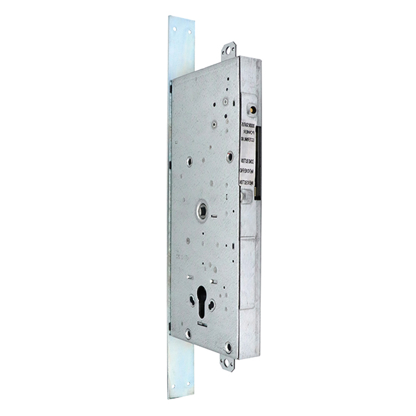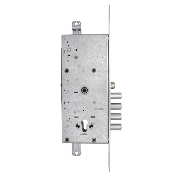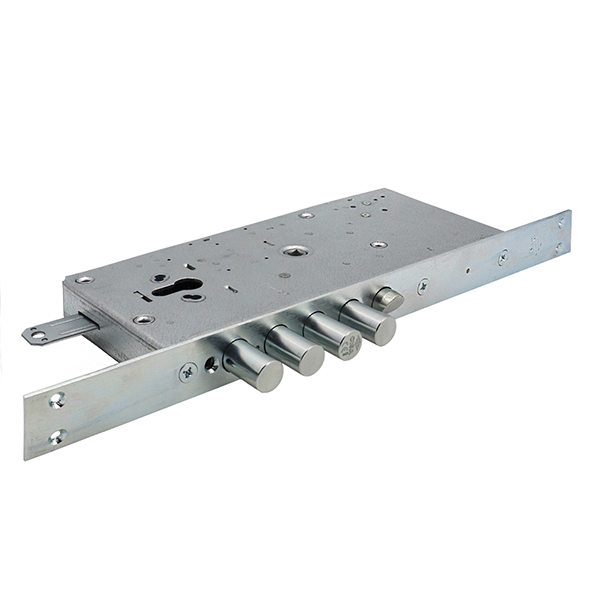 Данный замок владеет 6-м классом защиты по европейскому стандарту EN 14846:10. Он оснащен четырьмя высокопрочными оцинкованными ригелями из стали и язычком. Они обладают стойкостью к физическому излому. Корпус и торцевая планка изготовлены из стали. Также замок оснащен креплениями для тяг. Поэтому имеет 3 точки замыкания.
