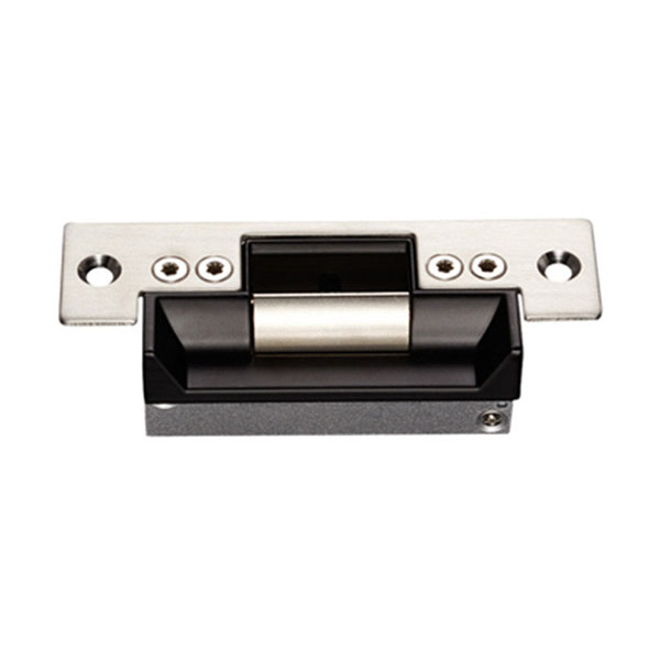Электрозащелка работает в нормально закрытом состоянии. Это означает, что она закрыта без питания, а отпирание происходит подачей напряжения. Оснащена датчиком состояния двери (открыта/закрыта). Напряжение составляет 12В постоянного тока. Поставляется с короткой планкой размером 123x43 мм.