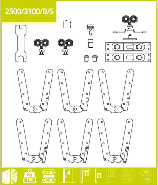 Итальянский производитель раздвижных систем Villes2000 создает свою продукцию, тесно сотрудничая с наиболее известными дизайнерами. Вместе со строгим контролем качества это дает потребителям отличный во всех смыслах ассортимент, который способен удовлетворить любые потребности. Данная модель VILLES 2500/3100/B/S предназначена для раздвижных межкомнатных дверей в формате "книжка". Она очень удачно впишется в любой дизайн - от классики до современного хай-тека, дополнительно создавая огромные дизайнерские возможности в интерьере. Кроме этого, такой вариант дверной раздвижной системы в процессе открывания и закрывания НЕ задействует полезное пространство жилой площади. С помощью него можно контролировать ширину проема в результате полного или частичного закрывания дверей. Комплект предназначен для ЧЕТЫРЕХ деревянных или профильных полотен шириной от 1200 мм, толщиной от 16 до 40 мм и весом каждого до 120 кг. Благодаря нейлоновым проводникам сборка дверей будет тихой и легкой. Монтируется данная модель как к потолку, так и к стене.