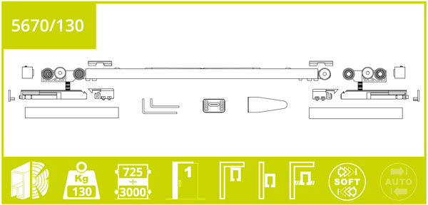 Описание Врезная раздвижная система VILLES 5670 длина 6 м на 1 полотно до 80 кг с двусторонним доводчиком