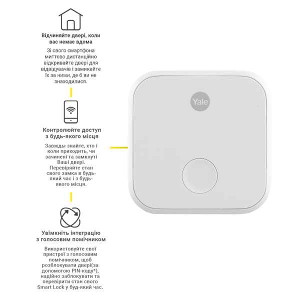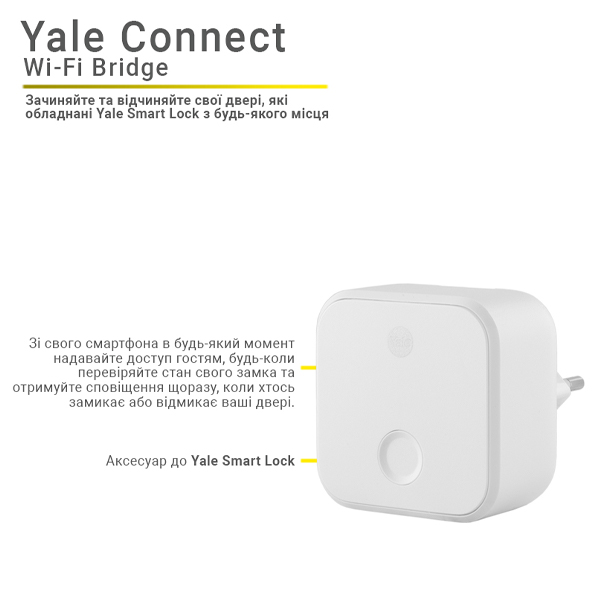 YALE LINUS – это устройство, с помощью которого умный замок YALE LINUS получает доступ к сети Интернет. Он устанавливается в розетку и подключается к замку с помощью Bluetooth. Соединение с роутером и другими устройствами умного дома происходит по сети WI-FI. Поэтому для правильной работы рекомендуется размещать его на расстоянии не более 2 м от двери и в зоне действия стойкого сигнала WI-FI. Хаб потребляет максимум 1,5 Вт энергии. Поэтому даже круглосуточное пребывание в сети не повлияет на счет электроэнергии.