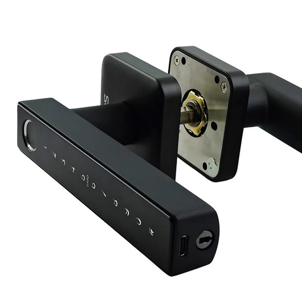 Проще говоря, PES Hand 2 – это накладной смарт-замок, который устанавливается накладным способом с внутренней и внешней стороны двери на врезную механическую часть замка. Работает от батареек типа АА, которых хватает примерно на 1 год использования. Имеет сенсорную клавиатуру для ввода пароля, датчик считывания отпечатка пальца на внешней части накладки.
