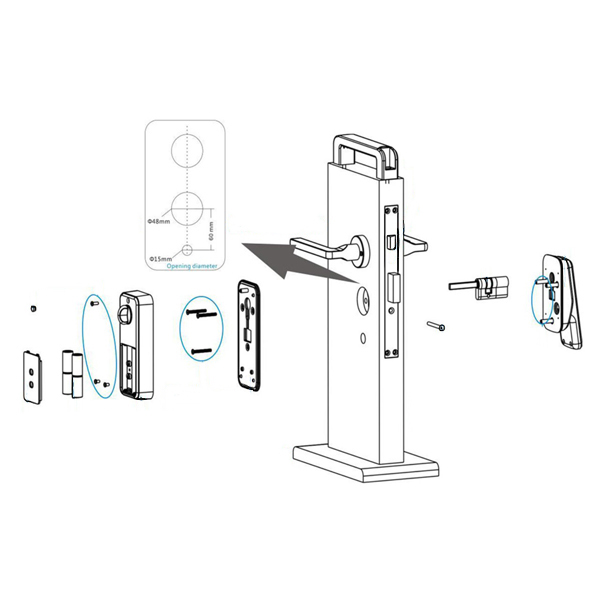 Проще говоря, PES David это накладной электромоторный замок с цилиндром стандарта EURO DIN. Устанавливается он через отверстия для внешней броненакладки и имеет длинный шток, что дает возможность установки на любые двери с любым типом закрывания. Имеет сенсорную панель для ввода пароля, датчик для считывания отпечатка пальца и режим "Не беспокоить" с внутренней части замка. Открыть дверь с данным смарт-замком можно с помощью: отпечатка пальца, пароля, брелка или NFC-метки, RFID-карты, смартфона с приложением Sorex Smart Lock.