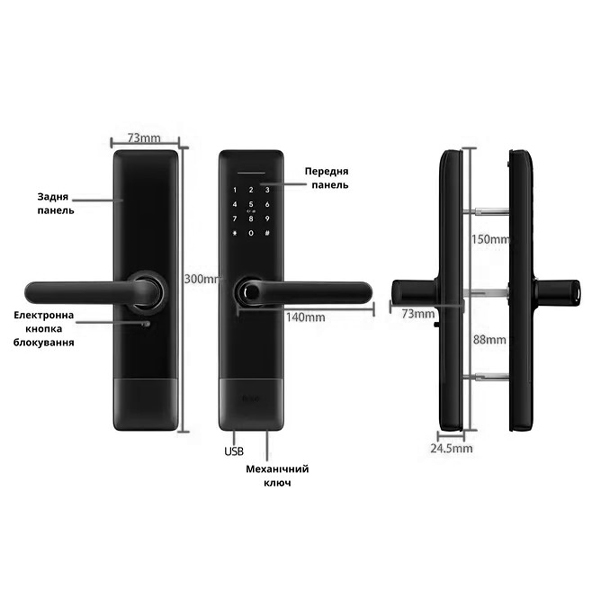 Открыть дверь с данным смарт-замком можно с помощью: отпечатка пальца, пароля, брелка или NFC-метки, RFID-карты, смартфона с использованием интернета и приложения Smarta Lock. Отмыкание механическим ключом также возможно – снизу на внешней планке для этого есть ключевое отверстие.