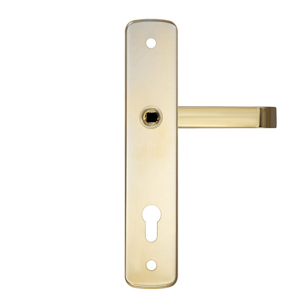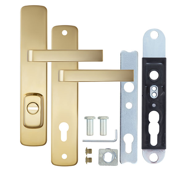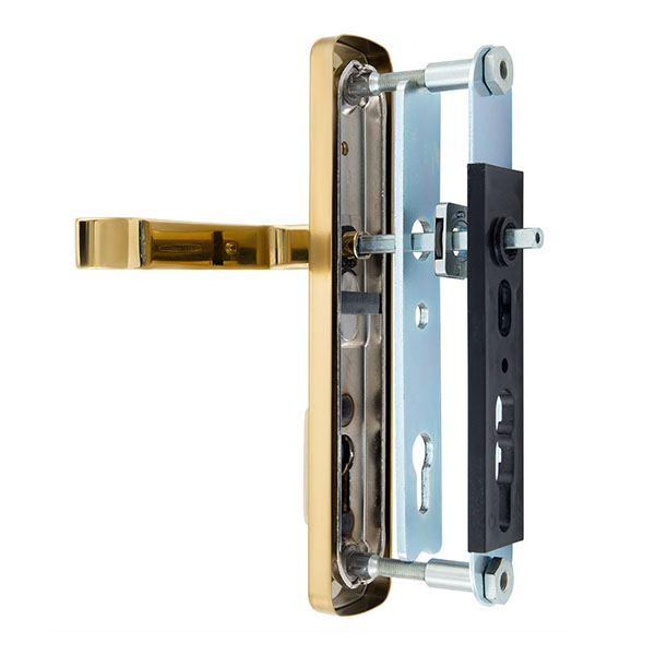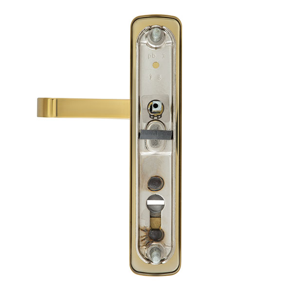Взломостойкие ручки на планке с протектором чешского производства ROSTEX. Если у Вас возникает потребность надежно защитить замок и сердцевину, то эта модель сможет полностью удовлетворить ее. Ручки изготавливаются из прочной нержавеющей стали, планки в свою очередь изготавливаются из цинкового сплава. Внешне планки не видно отверстий для крепления, они находятся в середине и фиксируются с помощью двух мощных винтов М8. Сердцевина защищена протектором с закаленной стали и шайбой с отверстием под ключ из нержавеющей стали. Благодаря этому эта модель имеет высокий уровень защиты от высверливания, взлома и другой силовых методов взлома. Цветовой оттенок защищен специальным методом гальваники, что гарантирует его устойчивость к стиранию в течение 120 месяцев. Яркий цвет - титан PVD - хорошо сочетается с интерьером в светло-золотых оттенках. Эта модель оснащена удобной нажимной частью с металлическим пружинным механизмом, благодаря чему ручки не будут провисать и расшатываться. При выборе обратите внимание на межосевое расстояние ручек и Вашего механизма замка. Данные ручки подходят только для механизмов замка с межосевым расстоянием 90 мм. При необходимости монтажа фурнитуры на широкие двери рекомендуем приобрести соответствующий удлинительный набор.
