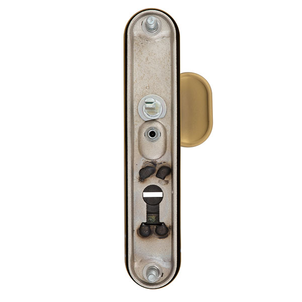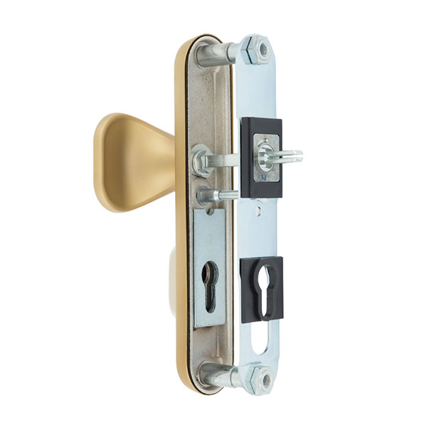 Взломостойкие ручки на планке с протектором чешского производства ROSTEX. Если у Вас возникает потребность надежно защитить замок и сердцевину, то эта модель сможет полностью удовлетворить ее. Ручки изготавливаются из прочной нержавеющей стали, планки в свою очередь изготавливаются из цинкового сплава. Внешне планки не видно отверстий для крепления, они находятся в середине и фиксируются с помощью двух мощных винтов М8. Сердцевина защищена протектором с закаленной стали и шайбой с отверстием под ключ из нержавеющей стали. Благодаря этому эта модель имеет высокий уровень защиты от высверливания, взлома и другой силовых методов взлома. Цветовой оттенок защищен специальным методом гальваники, что гарантирует его устойчивость к стиранию в течение 120 месяцев. Яркий цвет - титан PVD сатин - рекомендуем сочетать с интерьером в спокойных золотых оттенках. В этой модели тип ручек разный, с одной стороны это обычная нажимная, а с другой фиксированная. Обычно такие ручки используют в помещениях с большим трафиком людей. При выборе обратите внимание на межосевое расстояние ручек и Вашего механизма замка. Данные ручки подходят только для механизмов замка с межосевым расстоянием 85 мм. При необходимости монтажа фурнитуры на широкие двери рекомендуем приобрести соответствующий удлинительный набор.