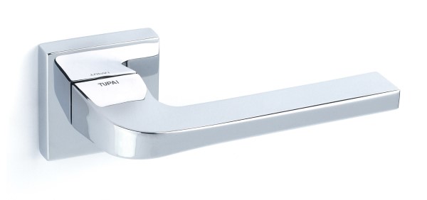Ручки на розетте португальского производства TUPAI. Дверная фурнитура сделана с учетом экологических европейских стандартов. Изготавливается из латуни по современным технологиям на фабрике в Португалии. Яркий цвет - хром полированный - наполнит интерьер Вашего помещения светлыми оттенками.. Покрытие наносится специальным методом гальваники в несколько слоев. Благодаря этому ручки будут выглядеть как новые до 24 месяцев. Дополнительно это обеспечивает устойчивость цвета к повреждению и царапинам. Современный дизайн в стиле хай-тек прекрасно дополнит дверное полотно с прямыми линиями.